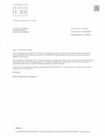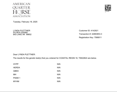 Registered with both The Jockey Club and the American Quarter Horse Association, she produces exceptional Appendix prospects that are eligible for registration and highly marketable.