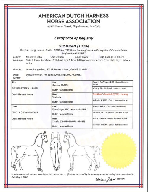 Alaska Horse Ranch is delighted to present our Dutch Harness Horse, and KWPN, stud colt, Obsidian! Obsidian is top for his breed, sired by Dondersteen, and out of Erbella, Obsidian exhibits all of the ideal qualities including natural leg action, a commanding presence, and floaty gaits. This young stud colt will add wonderful movement and temperament to your next foal!
